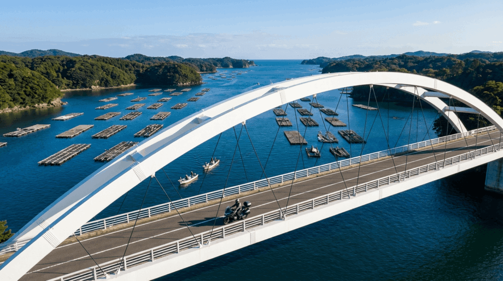 パールロードのハイライトの一つ。海を跨ぐ美しいアーチ橋で、橋の上からは牡蠣の養殖筏(いかだ)が無数に浮かぶ、伊勢志摩ならではの風景が見られます。橋を渡る瞬間の開放感は格別で、写真撮影スポットとしても人気です。