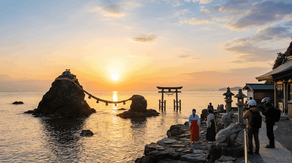 伊勢神宮参拝の前に訪れる「禊」の神社として知られています。海中に立つ夫婦岩は、日の出のシルエットが美しく、特に夏至の前後は多くのカメラマンが訪れます。