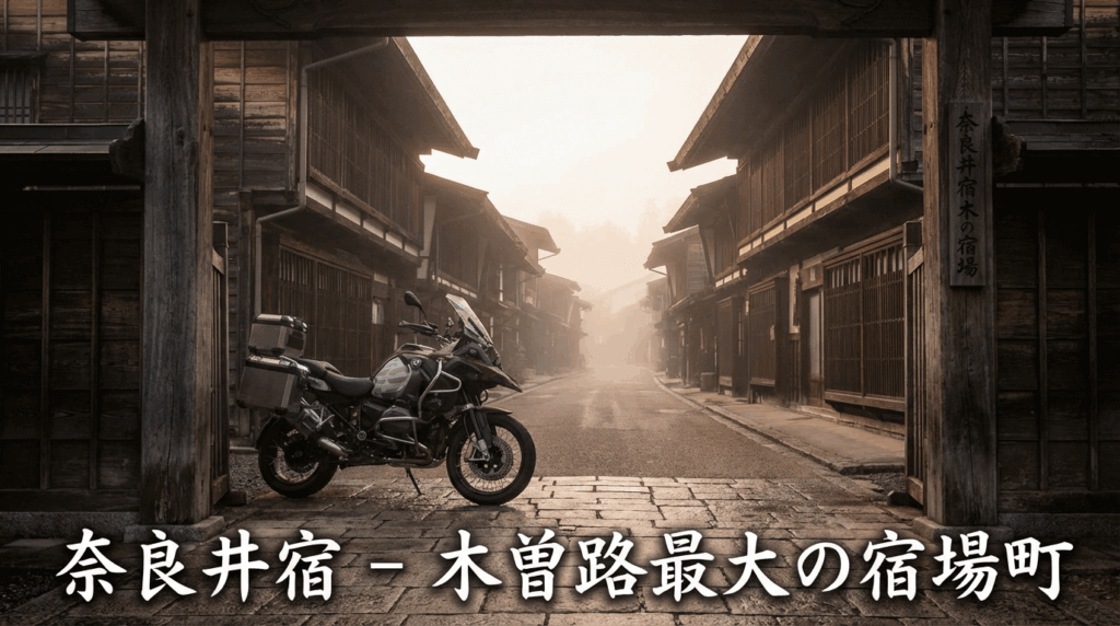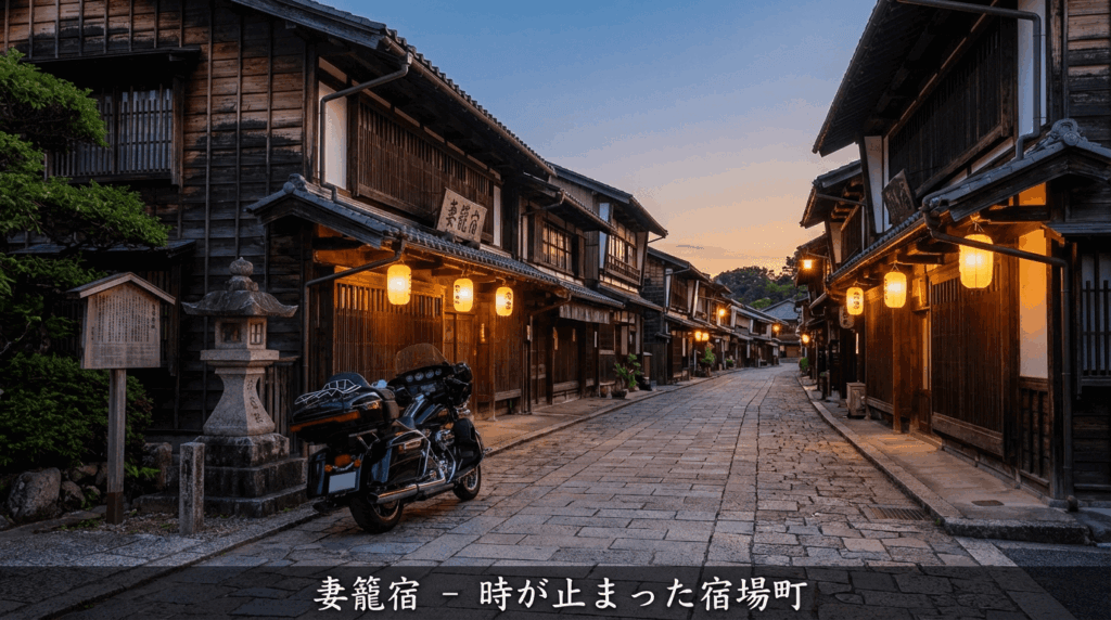 ライダーのための極意: 早朝7〜8時に訪れると、観光客がおらず静寂の中で江戸時代にタイムスリップできます。朝靄の中の宿場町は幻想的です。