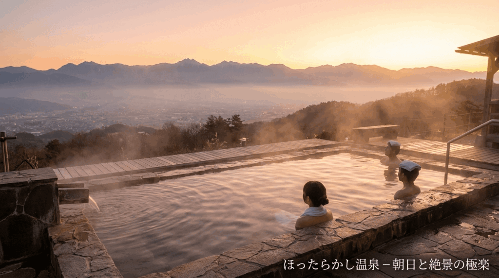 ライダーのための極意: 早朝5時台に到着し、「あっちの湯」で日の出を待つ。朝焼けに染まる甲府盆地と雲海の絶景は、人生の記憶に刻まれます。